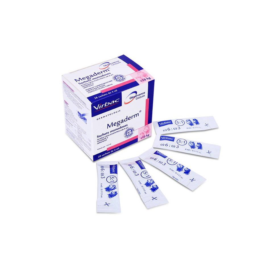 - Gel Ăn Dinh Dưỡng Cho Chó Mèo Dưới 10kg Virbac Megaderm TM cung cấp các axit béo thiết yếu từ nhóm omega 3 và omega 6 có nguồn gốc từ thiên nhiên. Với tỷ lệ lý tưởng 1:5, đảm bảo điều trị hiệu quả và kéo dài cho da lông bị hư hại. Sản phẩm giúp giảm rụng lông và làm lành vết thương trên da.